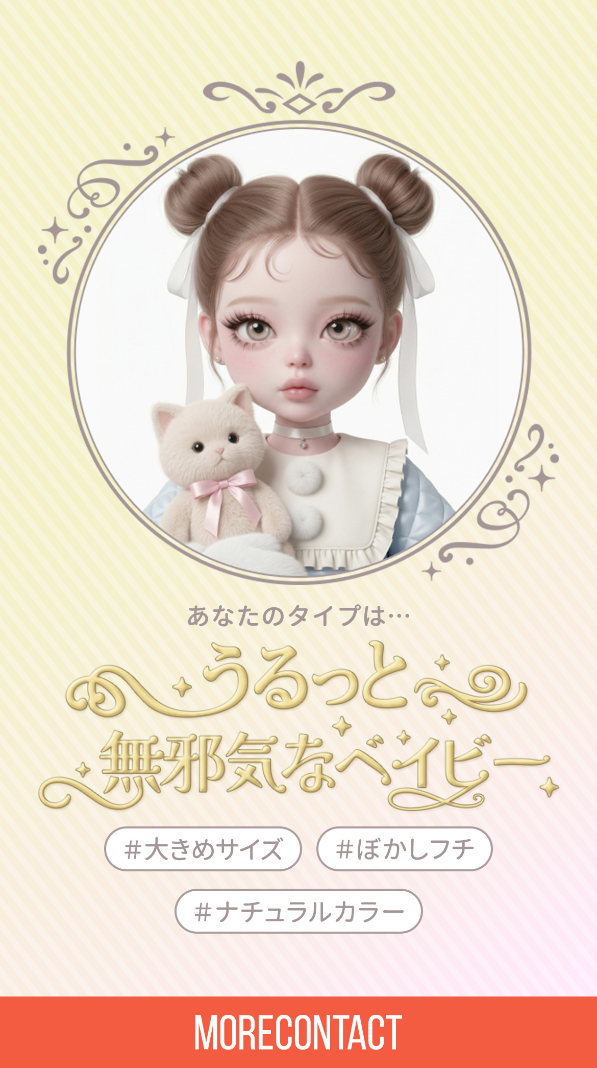若々しくピュアな子供顔に、すっきりとしたシャープな目元を持つタイプです。元の暗めの瞳を大きめサイズでトーンアップさせることで、子猫のように無邪気でうるうるとした愛されフェイスに垢抜けることができます。