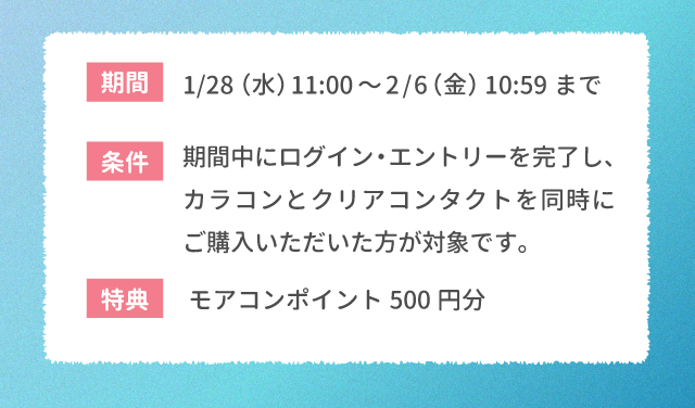 - キャンペーン期間中にカラコンをご購入いただくと、エントリー不要で自動的に500ポイント付与されます。