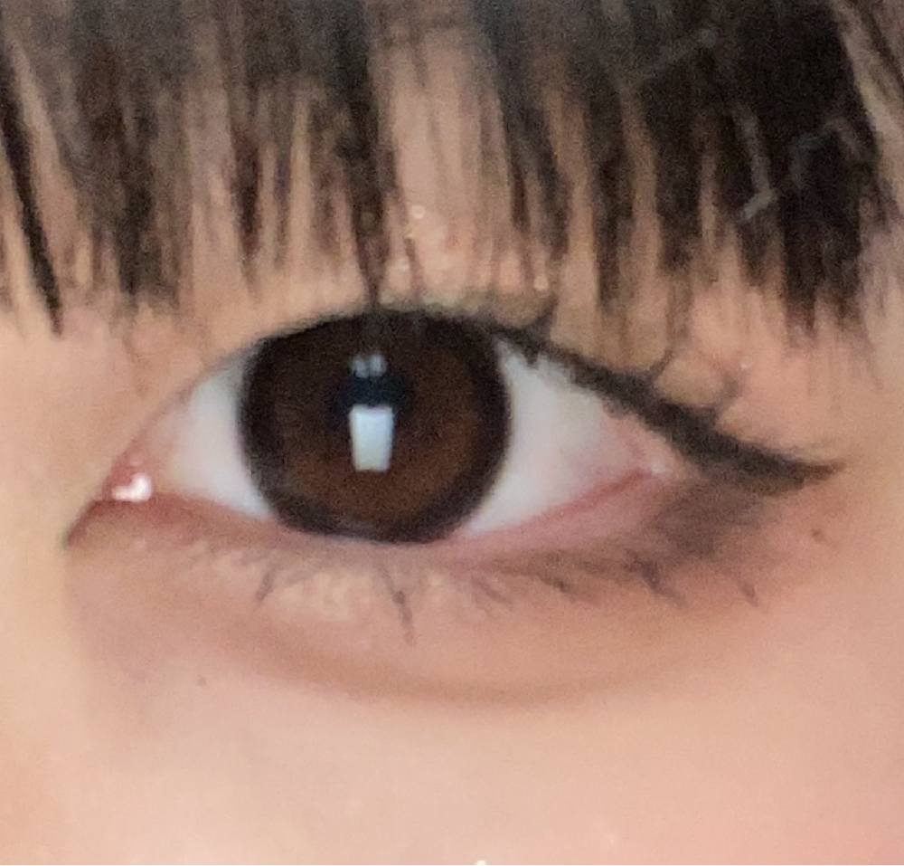 ほぼ黒に近い茶色の瞳です。黒々して宇宙人のようなカラコン!って感じではなく、デザインはとてもナチュラルで好きです。特に、ドットがかなり細かくて近くから見てもカラコン特有のドットが見えないくらいなところが気に入ってます。ただ、私の目が小さいからなんですが、同じデザインでもう少し着色直径がちいさければ最高……(ワンデーのペールミラージュ、ミストアイリスくらいの)