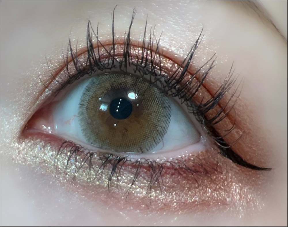 1枚目蛍光灯、2枚目自然光です。グリーンとグレーの中間のようなふんわりとした発色です。ドライアイじゃないですが朝つけて夕方には乾燥します。目薬させば耐えられる程度です。