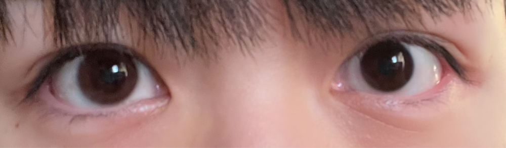 写真だと分かりづらいけど、きれいな茶色に発色してくれました!裸眼より一回り大きくしてくれるのでくりっとした印象の目になった気がします。ですが、一度学校につけていったけど秒でバレました。普段から茶目の人はわんちゃんいけると思うけど、黒目は校則厳しめのとこはキツいかも🥹