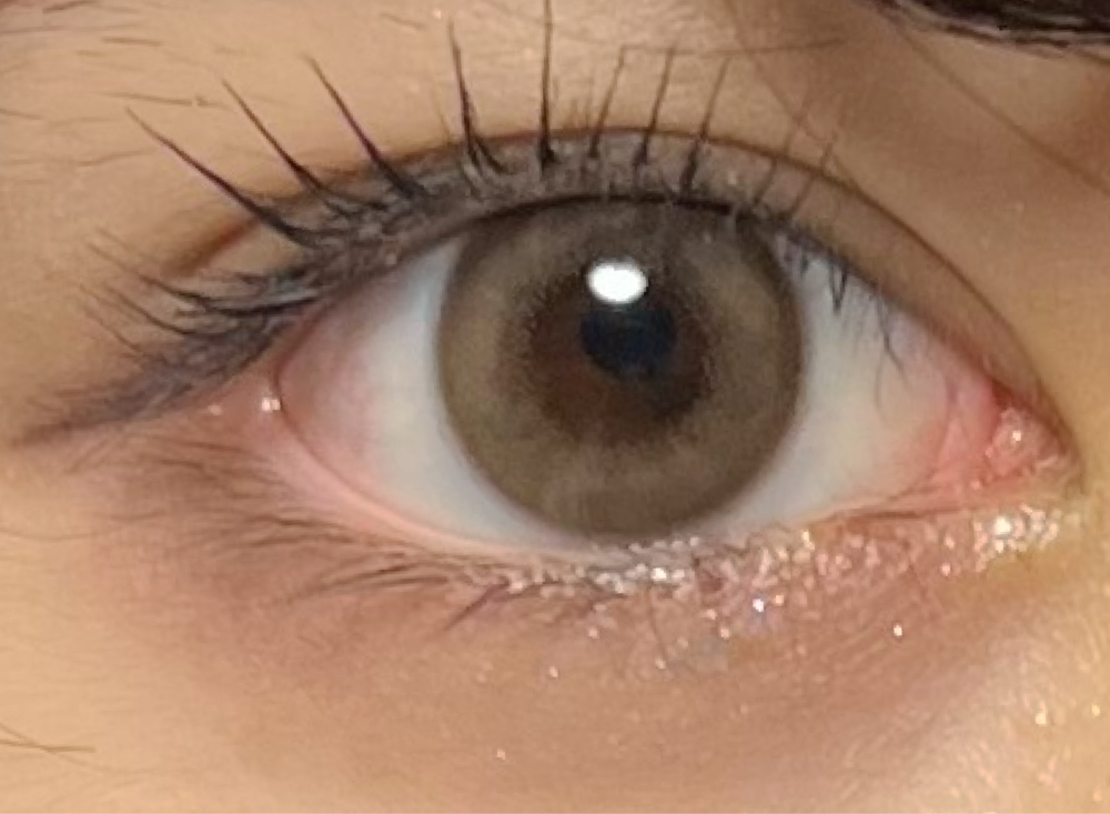 裸眼焦げ茶目です。1枚目外カメ、2枚目が内カメでどちらもフラッシュ有です。私の目だとフランミーはサンプル画像より暗めに発色します。キャラメルパイはグレージュっぽい色味で、派手過ぎずきゅるんとした目になりました。立体感が出るので写真盛れます!