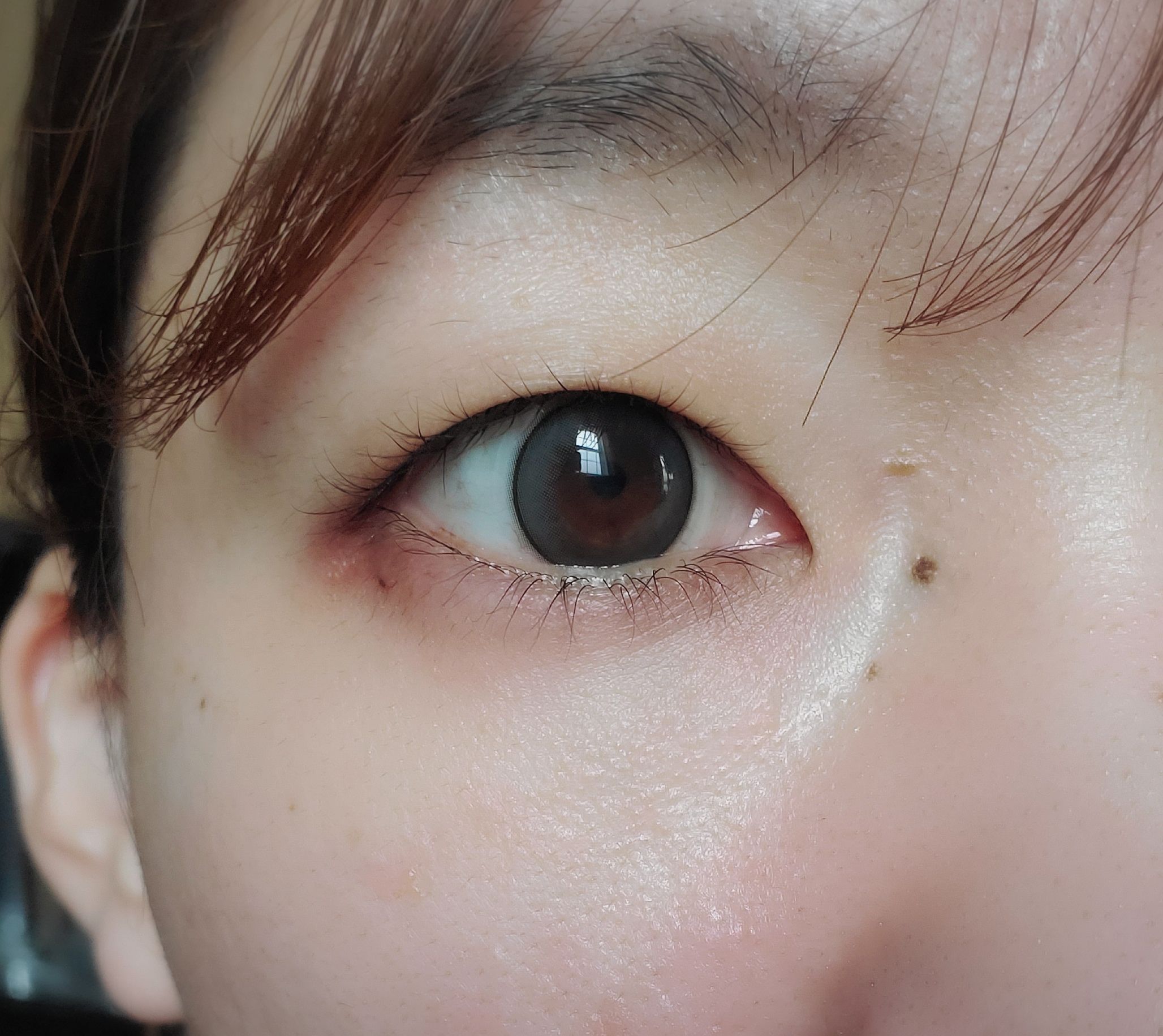 つけ始めて3週間くらい経つと、乾燥酷くなってくる。仕方ない。乾燥酷いのに気にせず使うとめっちゃ充血はじめるから、目が弱い人は気をつけて。着色直系小さい割に黒い細ふちがあるから盛れる。体感少し大きめに感じる。私はめちゃくちゃ黒目の色素強いけど、光当たれば綺麗に発色します。