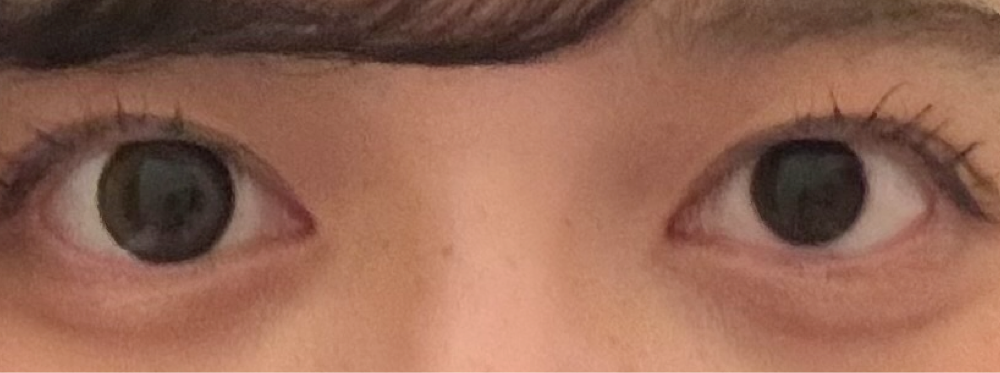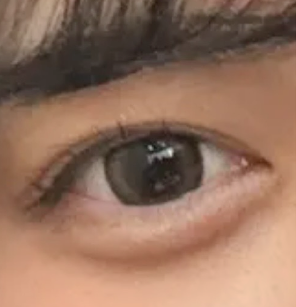 内側が明るくて太フチのデザインなのでギャルっぽいのかなと思いましたが、付けてみると想像よりも馴染みました!裸眼が茶色っぽいとワントーン暗くなる感じなので、黒目が強調されてクリクリの目になります。量産とかスナ系の子が付けてそうなイメージです(笑)
