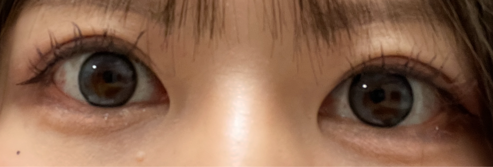 裸眼が焦茶〜黒です。ハイライトが白みっぽい青で、目がきゅるきゅるした感じになりました。色味がすごく可愛いです!個人的にモラクのドーリッシュグレーの縁の細さが好みなので、少し縁が太めかな?と思います。クール寄りの顔立ちだと、すこし目が浮いてしまう感じがしました。この辺は好みの問題かな〜という気はします。