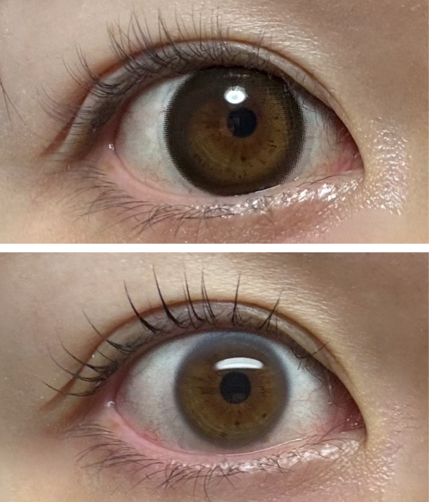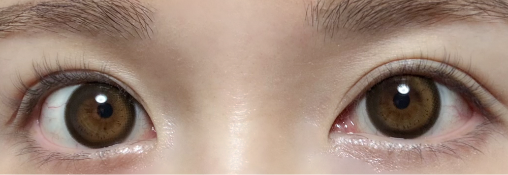 【1枚目】自然光【2枚目】室内光(右目の水光が回ってる状態)回っても可愛いというレビューを多く見たので買いましたがやっぱり気になる‼️オーレンズのビッググローイのモカブラウンにじゃっっっかん似てるかも?って感じでした。黒目奥目です。もっと茶色に発色して欲しい人は物足りないと思います。