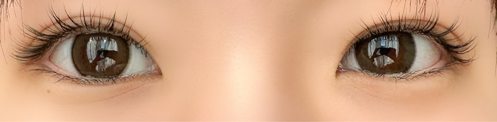 裸眼は焦茶目の縁は黒って感じで、装着すると結構黒目でっかい感じになります。光が当たると透けて透明感も出ますが、当たらないとわりとカラコン入れてます感は出るかな。昔の宇宙人ぽくなる黒デカ目とは違うのでご安心を!