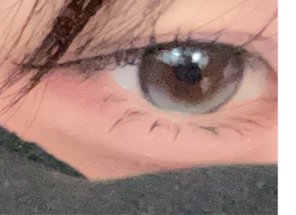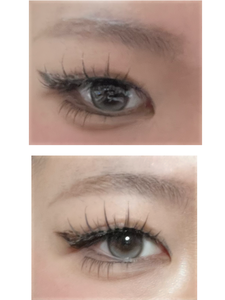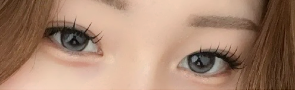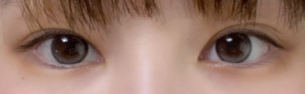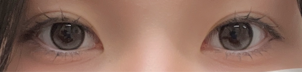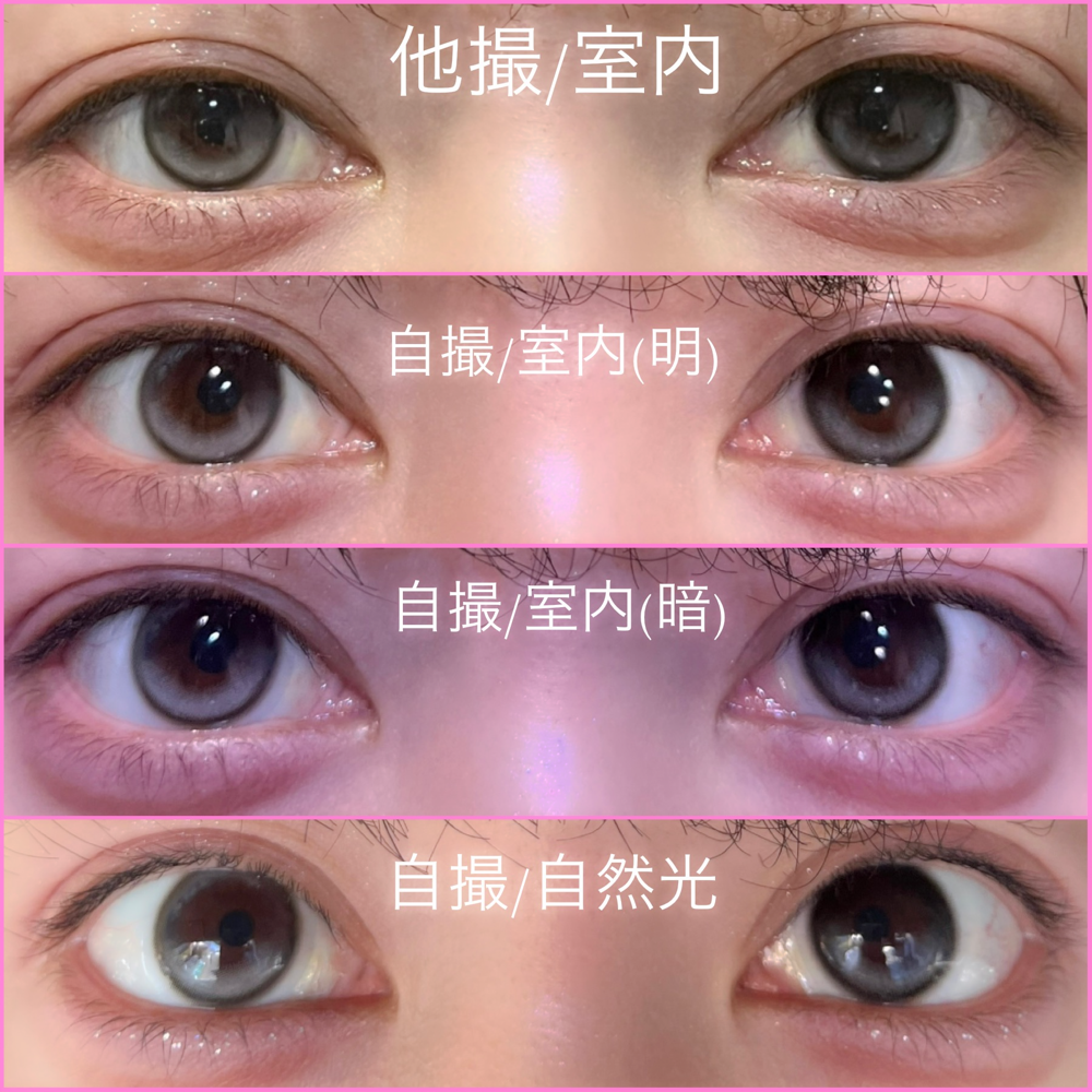 小粒目奥目黒目、室内光とプリクラ(わたウサ)の比較です♩暗い場所でも分かる白みグレーです!上のハイライトの位置が絶妙で最高に盛れます❤︎