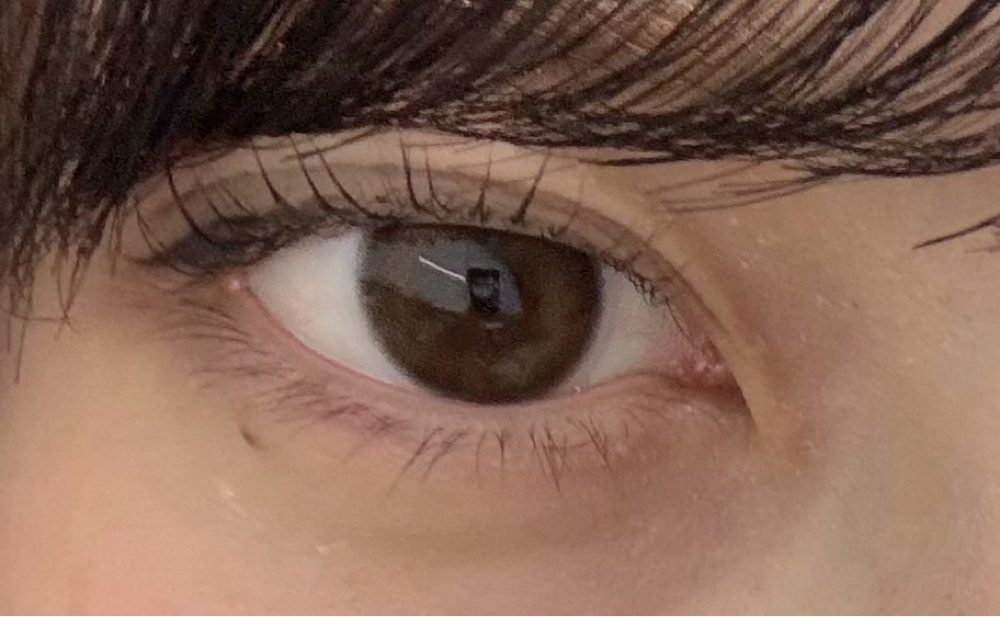 焦茶目の裸眼を少しだけ強調するダークブラウンと、内側に黄みっぽい超ナチュラルハイライトがデザインされてて、バレないし顔の印象はあまり変わらないけど目が目立つ感じ。黒コン似合わないけどこれはダークブラウンだからいけた!