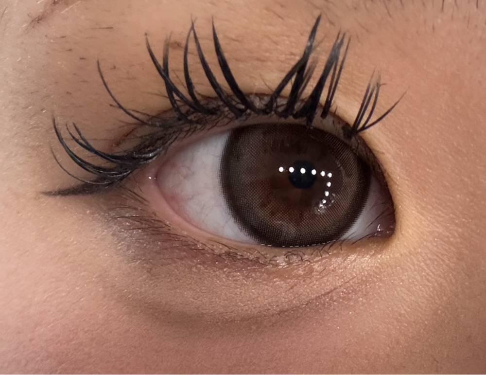 黒目だからなのか、柄‼︎って感じはあんまなくて、その分フチと中の色がはっきり分かれて発色する。商品の写真だとぼやけた感じに見えるけど実際はそんなことなかったです!ギャルの雰囲気出したい時に使ってます。写真はビーリアル自然光
