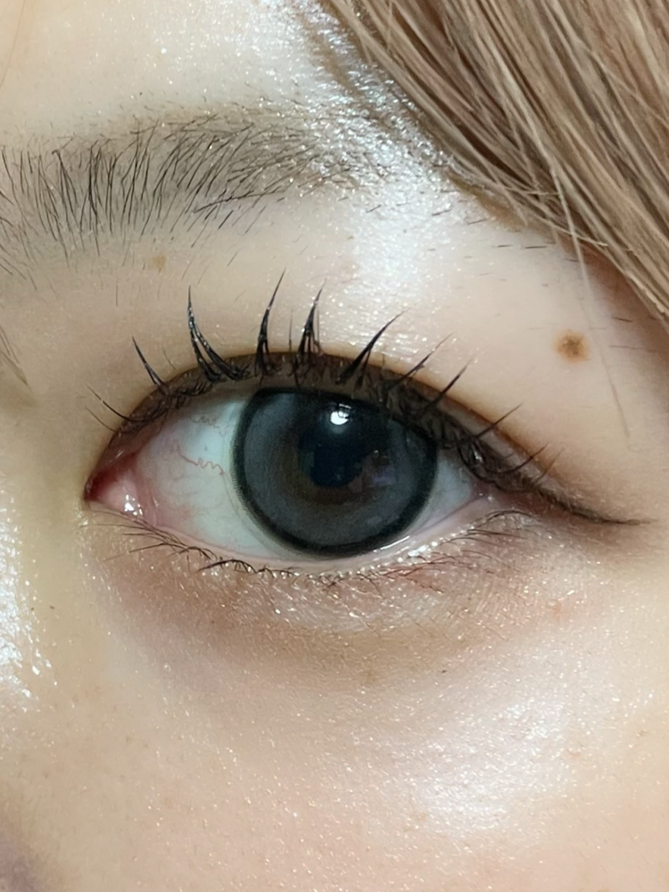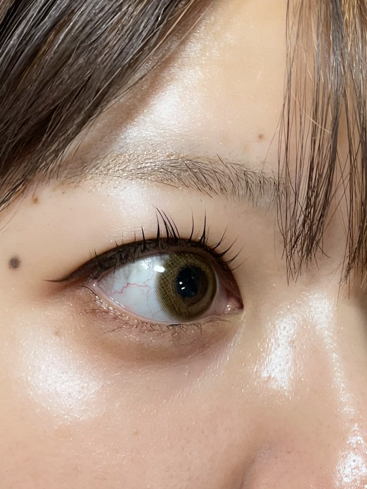 くりっと存在感のあるレンズ。発色も派手すぎないのに、グレーってわかる!レンズ単体で見ると緑がかっているのに目につけると全然わからない。レンズに厚みがあって乾燥しない、着け心地も◎