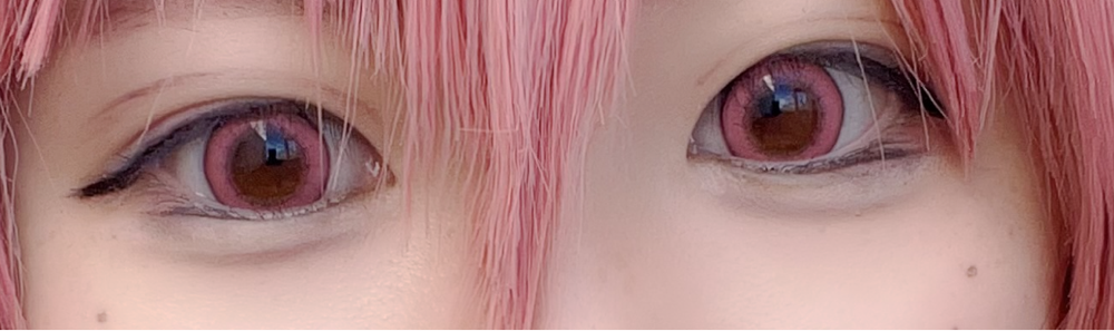 かなり発色が良くて、暗所でもはっきり分かるレベルの明るめピンクで可愛いです!着色直径14mmでレンズ自体は大きく感じましたが、付けてみると体感そんなに無さそうに見えました